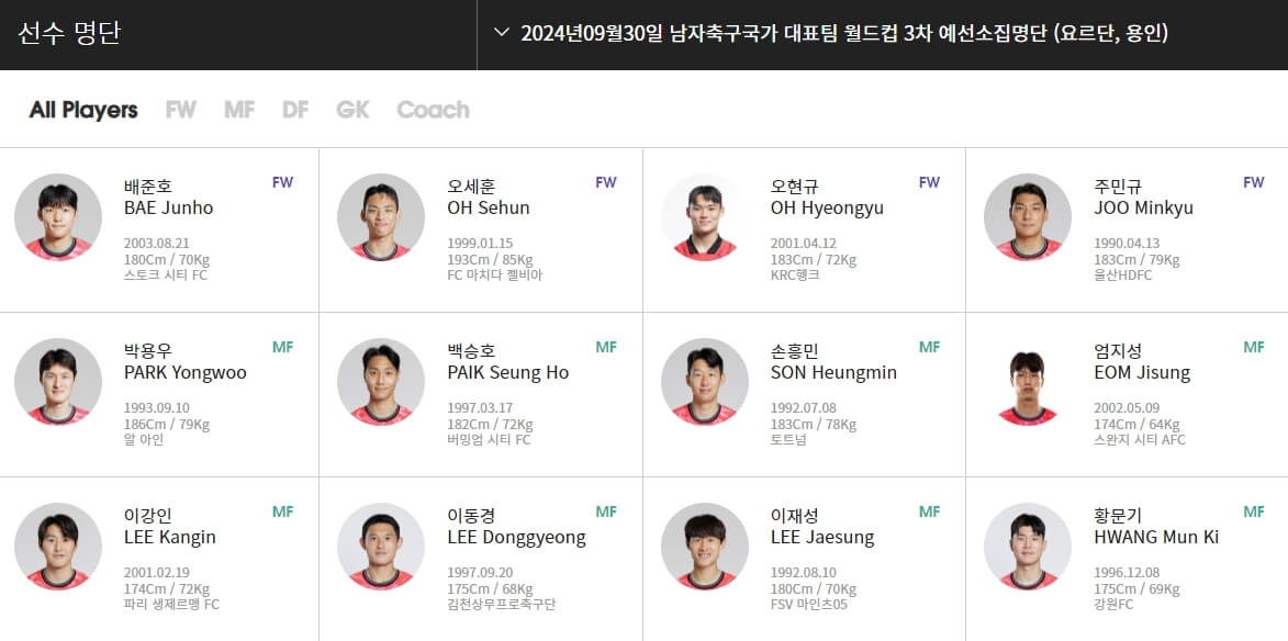 ✅DF: 김민재(뮌헨), 김주성(FC서울), 박민규(콘사도레삿포로), 설영우(즈베즈다), 이명재(울산 HD), 이한범(미트윌란), 조유민(샤르자), 정승현(알와슬), 황문기(강원FC)