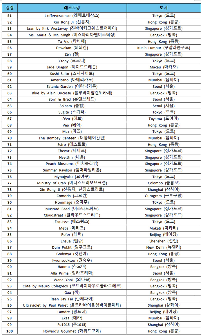 2024 아시아50 베스트레스토랑 1-100 리스트