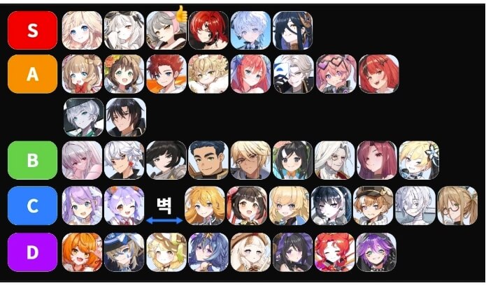 현재 캐릭터 티어는 S, A, B, C,D 로 나뉘며, S 등급의 캐릭터는 최고의 능력을 가진 캐릭터이며, B등급 캐릭터는 기본적인 능력을 가졌기 때문에 초보자에게 적절합니다. C등급과 D등급은 게임 초반에 사용할 수있는 캐릭터 입니다.