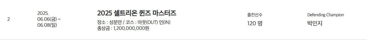 KLPGA는 2025년 6월 6일부터 3일간, 강원도 원주시 성문안CC에서 총상금 12억 원 규모의 셀트리온 퀸즈 마스터즈가 열릴 것이라고 공식 발표했습니다. 해당 대회는 최근까지 개최 여부가 불투명했었지만, 김상열 회장의 취임과 함께 정상 개최가 확정되었습니다.