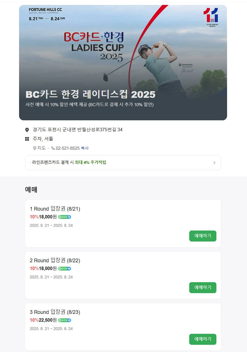 2025년 08월 21일(목) ~ 24일(일)까지 포천힐스 컨트리클럽에서 진행되는 bc카드 한경 레이디스컵 2025 티켓을 온라인으로 사전예매시 최대 20% 할인을 받을 수 있으니 현장에서 직관하실 분들을 미리 예매해두세요~