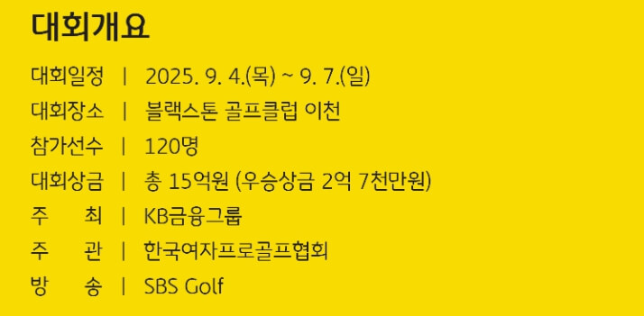 가을의 문턱 9월 이천에서 여자골프선수들의 경쟁이 펼쳐집니다. KB금융 스타챔피언십 2025 티켓 할인 예매, 블랙스톤 리조트 이천cc 주자창 셔틀, 우승상금을 빠르게 안내드립니다.