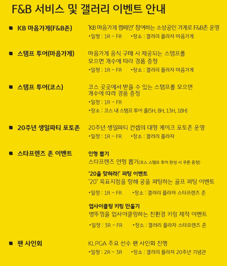 KB금융의 대표 소상공인 지원 프로그램인 'KB마음가게' 소상공인이 참여해 갤러리들에게 합리적인 가격의 다양한 먹거리를 제공합니다. 또한 2021년 도입된 '캐디 지원 프로그램'을 통해 캐디에게 50만원의 후원금을 지급하며, 컷 탈락 선수들에게도 1인당 30만원의 지원금을 제공합니다.
