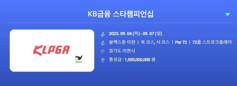 20년의 역사와 전통을 바탕으로 한 KB금융 스타챔피언십은 국내 최정상급 선수들이 총출동하여 많은 골프 팬들이 기대하고 있는 대회 중 하나입니다. 총 상금은 15억 원이며, 1등 우승상금 2억7천만 원 입니다. 이번 대회에 어느 선수가 1등 상금을 차지하게 될지 너무 궁금해 집니다~