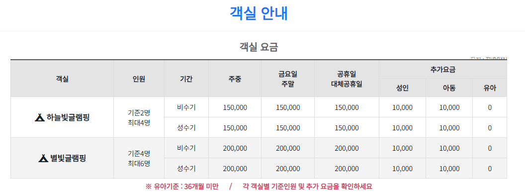 하늘빛글램핑과 별빛글램핑으로 나눠져 있으니, 기준인원~최대인원과 기간에따른 비수기 성수기 요금을 확인하셔서